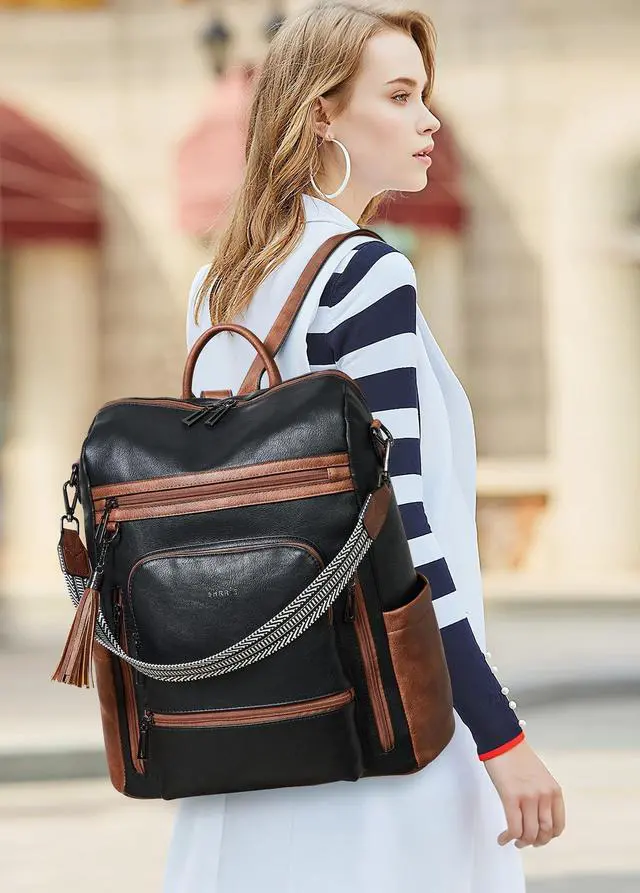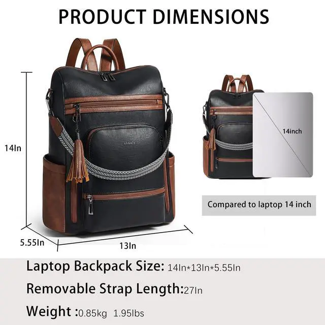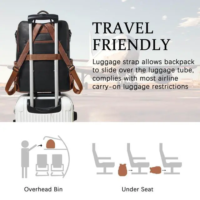 Leather Laptop Backpack for WomenMade of high quality waterproof Vegan leather, HEAVY DUTY & DURABLE. Total of 9 pockets, easy to organize all work necessities, college supplies, travel essentials. ^^ Practical Backpack Luggage Strap DesignDesigned for traveling, it helps you free your hands and back from the burden. Make your travel more convenient and enjoyable. Waterproof travel backpack fits under the seat also meets airline carry-on requirements. ^^ Large CapacityThe large capacity laptop backpack has multiple divider pockets, easy for holding laptop, ipads, Phone, binder, water bottle, umbrella, magazine, pens, wallet and so on.