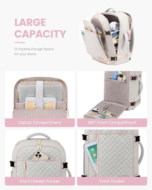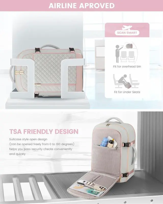 AIRLINE APPROVED TRAVEL BAG The size of the carry-on backpack is 13.6 * 9.1 * 20.1 inches. Meets the maximum size allowed by most International Air Transport Association (IATA) flights, and can be placed in the overhead luggage compartment and under seat luggage for airlines, suitable for Spirit, Frontier, Easy Jet, Jet Blue, and other airlines. ^^ DESIGN LIKE SUITCASE Say goodbye to awkward packing and disorganized luggage. This backpack boasts multiple compartments, interior pockets, and compression straps to keep your clothes, shoes, electronics, and travel essentials neatly organized and secure during your journey.