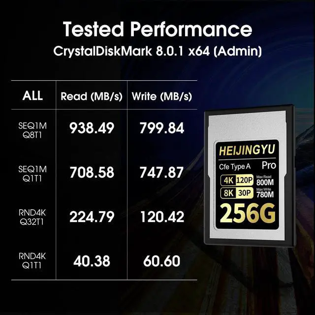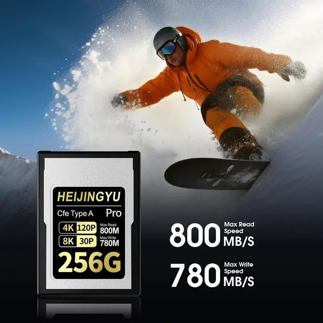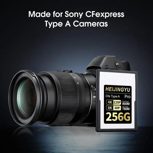 Large Capacity, Continuous Recording at 4K/8K HEIJINGYU 256GB CFexpress Type A memory card, specially designed for high resolution video recording, for continuous recording up to 8K RAW. ^^ Stable Performance HEIJINGYU 256GB CFexpress Type A card provides maximum read speeds of up to 800MB/s and write speeds up to 780MB/s, with a sustained write speed of 390MB/s. Speeds are based on internal testing. Actual transfer rates and capacity may vary depending on host device, file attributes, system hardware, and other factors. ^^ Compatible with Sony Alpha & FX CamerasHEIJINGYU 256GB CFexpress Type A Card has been approved for Sony A9III, A1, A1II, A7S3, A7M4, A7R5, FR7, FX6, FX3 and FX30 cameras.
