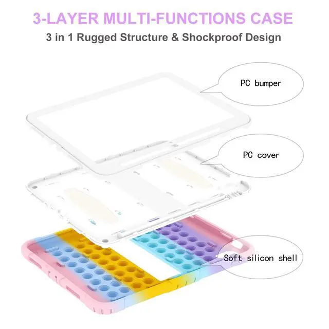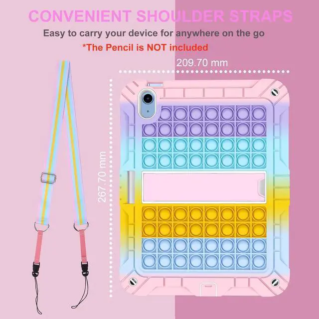 CompatibilityExclusively designed for iPad (A16) 11th generation 11-inch 2025 (Model: A3354, A3355, A3356), iPad 10th generation 10.9 -inch 2022 (Model: A2696, A2757, A2777), [No Screen Protector] DO NOT fit other iPad ^^ Special Design iPad 10th Generation CaseThe ingenious combination of iPad case and the most popular bubbble element. It is also a great decompression artifact while protecting the iPad. ^^ 3 Layer Design 10th Gen iPad CaseThree-layer structure of premium shock-absorbing TPU and durable hard polycarbonate provide a perfect protection against accidental drops, scratches, bumps and shock. ^^ Built-in Pencil Holder & Kickstand & Carrying StrapThis shockproof ipad 11th generation case has a built-in sturdy kickstand. Portable Shoulder Strap allows to carry your iPad in landscape/portrait mode securely in outdoors or hang your iPad. Designed with a pencil holder easily to carry your Apple pencil with your device.
