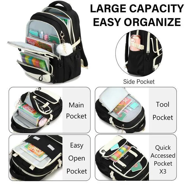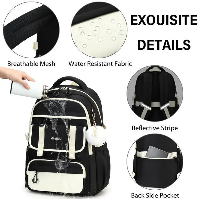 Capacity and Multi-compartments: The girl's backpack measures 12.5 * 7.9 * 17.6 with seven separate pockets of different sizes and two side pockets. The two front zip pockets can hold small items; there is a Velcro pocket for quicker access; the other three larger zip pockets can hold a 15-inch laptop, iPad, textbooks, etc.; and the elasticated side pockets can hold water bottles and umbrellas. In addition, an anti-theft pocket on the back protects the privacy of your belongings ^^