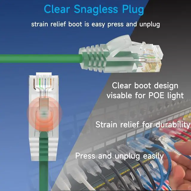 ^^ Clear Snagless Plug: Network patch cables are made of clear tap Snagless plug with strain relief boot for maximum durability. Cat6 patch cords with snagless plug is easy press and unplug. Clear boot of slim cat6 patch cable allows to see the light of the POE ports easily.