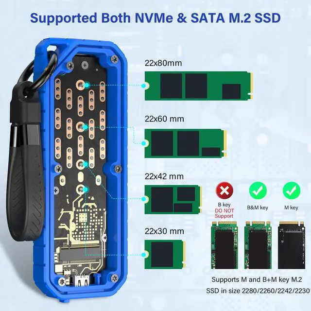 Protocols ]: M. 2 SSD enclosure compatible with both NVMe / PCIE and SATA / NGFF in sizes 2230/2242/2260/2280, such as M. 2 NVMe / PCIE M key, NVMe / PCIe and SATA / NGFF B&M key SSD. Advanced RTL9210B chip, built with short-circuit, over-current and multi-protection to ensure safety for your SSD and valuable data, as well as supporting UASP/ Trim with fast transmission speed. But M. 2 to USB SSD reader Do NOT Compatible with M. 2 SATA AHCI B Key SSDs.
