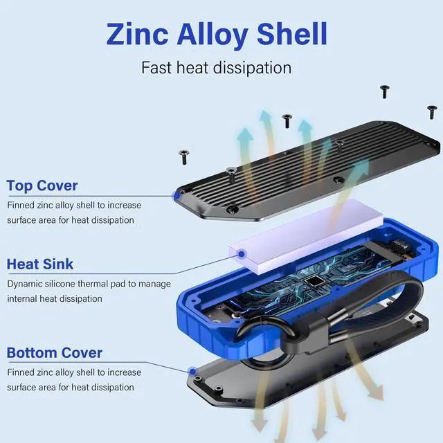 ^^ [High-quality Materials]: NVMe to USB adapter is designed with zinc alloy and silicone-wrapped edges, M. 2 external enclosure are rugged, durable, waterproof, dustproof, and scratch resistant. The silicone heat pad comes with our M. 2 reader enclosure and excellent heat dissipation.