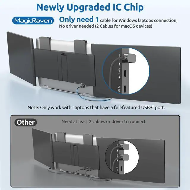 & Play: 1 USB-C cable connection for Windows laptop and 2 cables connection for macOS laptop. No driver or APP need. True plug-and-play! MagicRaven Triple monitor provides you with perfect multi-screen real-time display and multi-screen independent display solutions. Ideal for easy on-the-go travel dual-monitor setups.