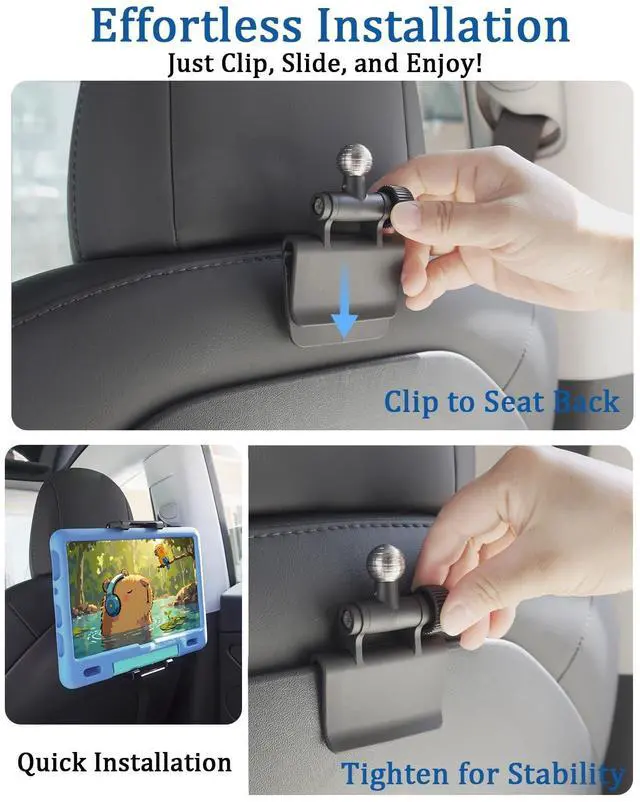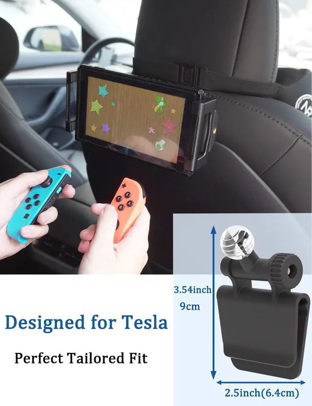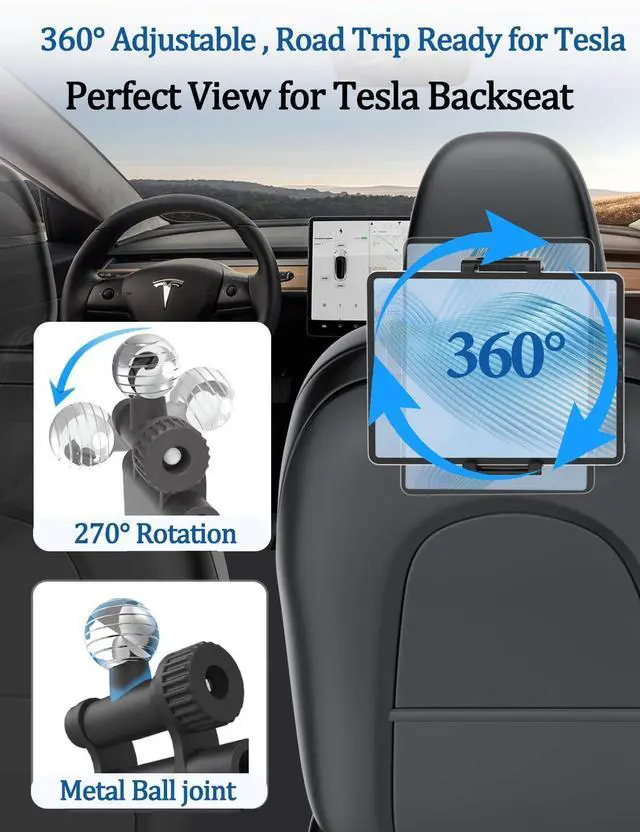[Tesla Seat Dedicated Tablet Holder] This headrest tablet mount is compatible with Tesla Model 3 2017-2023, Tesla Model Y 2020-2025, Tesla Model S 2021-2024 and Tesla Model X 2021-2024 (NOT FIT Tesla Model 3 2024). The Tesla seat back panel and leather gap wedge installation structure is adopted, and the fixing is completed in 3 seconds without tools. ^^ [360 Rotation Ball Joint] This tesla seat back tablet holder features a 360 rotating ball joint, letting you easily switch between horizontal and vertical viewing for the best comfort. It folds neatly when not in use, staying out of the way when kids get in the car, and blends seamlessly with Tesla interiors for a sleek, factory look.