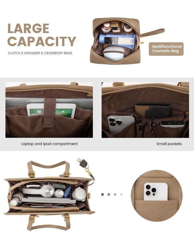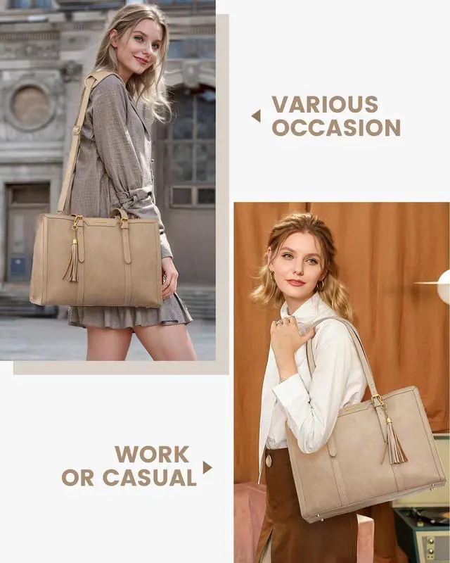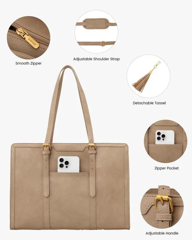 Elegant Laptop Tote Bag & Stand Upright This laptop bag for women combines vintage charm with modern fashion, making it a classic accessory that never goes out of style. Its metal feet ensure that the work bag stands upright and maintains its shape, adding to its overall sophisticated look. ^^ Large Capacity & Multi-Pocket Tote Bag With multiple pockets and compartments, this work bag offers generous storage capacity. Organize and carry all your essential items, such as your laptop, Water bottle, notebooks, pens, and more, with ease and convenience.
