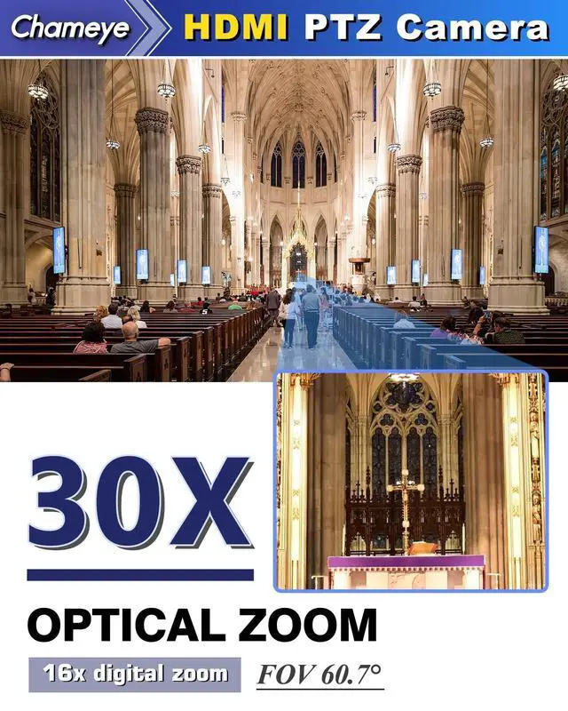 Chameye AI-Auto Tracking PTZ Camera 30xHDMI PTZ Camera with 30x Optical Zoom. 3G-SDI IP USB HDMI PTZ Camera features 1/ 2.8 -inch CMOS sensor, 2.07MP effective pixel, up to 1080p 60fps resolution. PoE Supported. Suitable for live streaming, Church live service, Education, Teaching Broadcast, Conference, Esports, Events etc. ^^ HDMI PTZ Camera with 30x optical zoomSupport 30x optical zoom + 8x digital zoom ( 60.7 degrees View Angle). Ture to life colors and fast focus with pretty picture quality. HD 1080p PTZ Camera with rich video formats 1080P60/50, 1080P30/25, 720P60/50, 720P30/25.