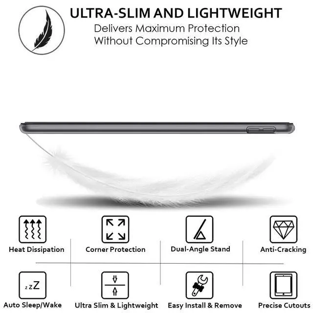 • Ultra Slim & Lightweight Profile Premium PU Leather Soft-Touch Front Exterior, Soft Scratch-Free Microfiber Interior offer great Protection & Translucent Back makes beauty of your iPad visible. High Quality Lightweight Material & Excellent design makes this case feel very Stylish & Premium & Fully Protects your device against Shock, Abrasion, Scratch, Fingerprint, Slips, Dirt & Corner Damages.