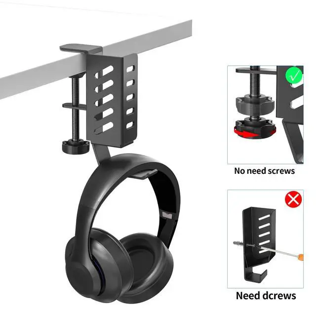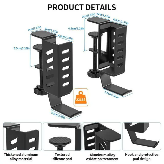 Versatile Desk Organizer This adjustable desk side laptop holder securely stores laptops, tablets, keyboards, and more. Features a convenient headphone stand to keep your workspace tidy and clutter-free. Perfect for home, office, or gaming setups. ^^ Heavy-Duty Steel Construction Made from durable carbon steel with a 22-pound load capacity, this clamp-on organizer is built to last. The sturdy design ensures stability for all your devices, from laptops to game consoles. ^^ Non-Slip Silicone Protection Equipped with silicone pads on both the clamp and rack to prevent scratches and slips.