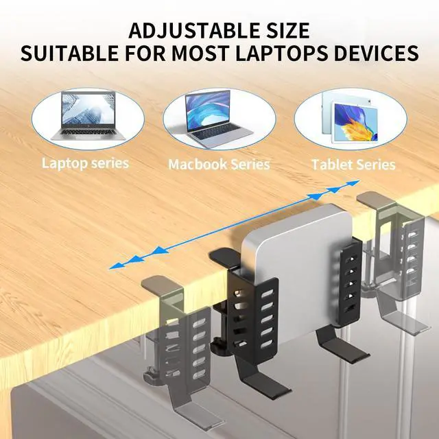 Safely holds your devices without damaging your desk or equipment. ^^ Easy No-Drill Installation Simply attach to any desk edge ( 0.2 - 2.2 inches thick) and tighten the clampno tools or drilling required. Adjustable width fits most laptops and tablets effortlessly. ^^ Multi-Purpose & Reliable Ideal for organizing small items like magazines, umbrellas, or hats. Backed by a 1-year warrantycontact us for any issues (artificial damage not included).