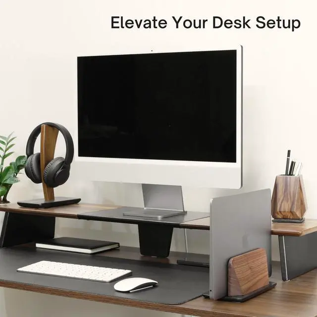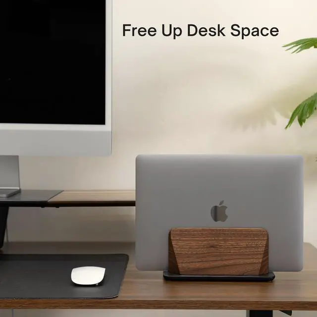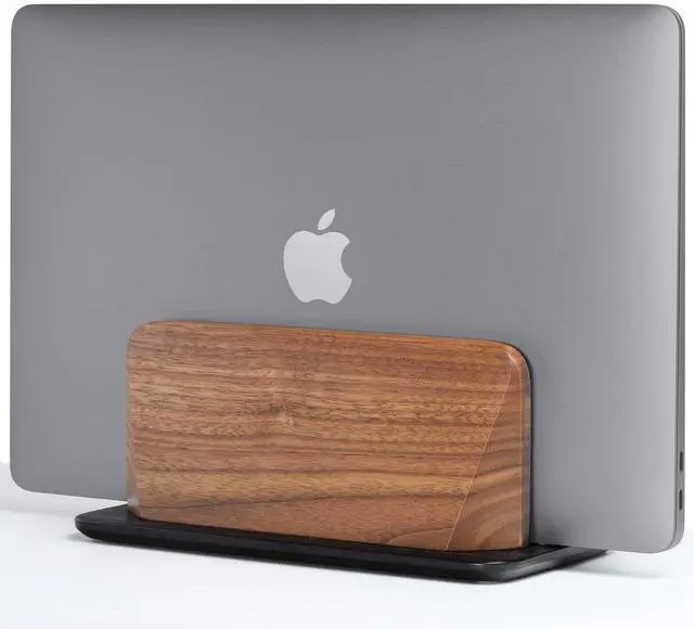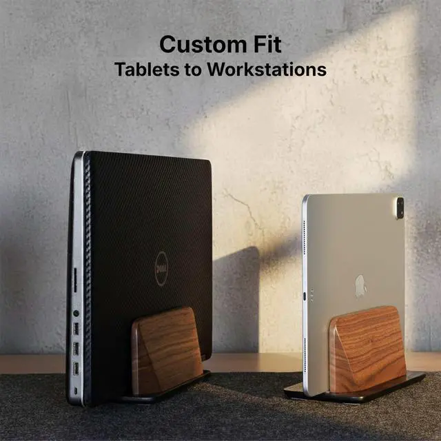 ELEVATE YOUR WORKSPACE - Instantly reclaim desk space. This premium laptop stand vertical holds your notebook upright, turning a cluttered desk into a professional setup. Crafted from genuine Black Walnut, Ash for a warm, sophisticated look. ^^ A PERFECT, CUSTOM FIT ( 0.47" - 1.57" Width) - A smart, screw-adjustable base ensures this laptop stand wood provides a precise fit for devices from 0.35 to 1.5 thick. Ideal for iPads, MacBooks, Dell XPS, and most modern laptops. ^^ SCRATCH PROTECTION - We protect your expensive asset.