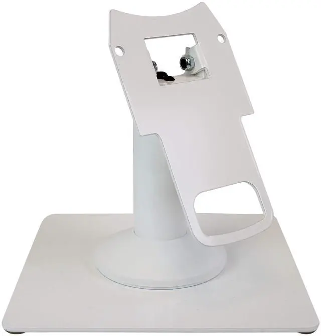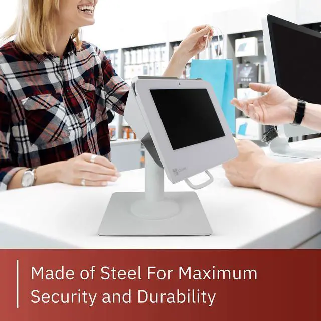 Manufactured in sturdy steel with durable powder coated finish ^^ Essential to enhance customer experience stand can tilt up to 60 and swivel a full 190, making moving device from customer to merchant easier; improves payment transaction ^^ Ultimate convenience for merchant and customer; designed to bring terminal closer to the customer; stand is upgradeable in the field with a simple top plate swap; stand is compatible with any round or square DCCStands freestanding plate ^^ Stand allows for seamless customer interactions with less danger of harm to equipment; flange cover hides wires and mount keeps terminal secure for minimized chances of damage and theft to POS terminal; durable powder coated finish protects stand ^^ Includes 8" x 8" square countertop plate which increases flexibility and allows the mount to be freestanding.