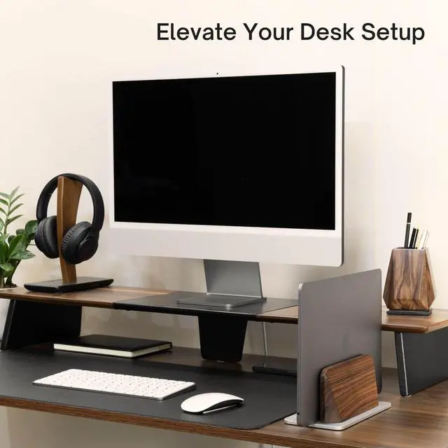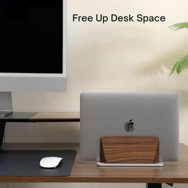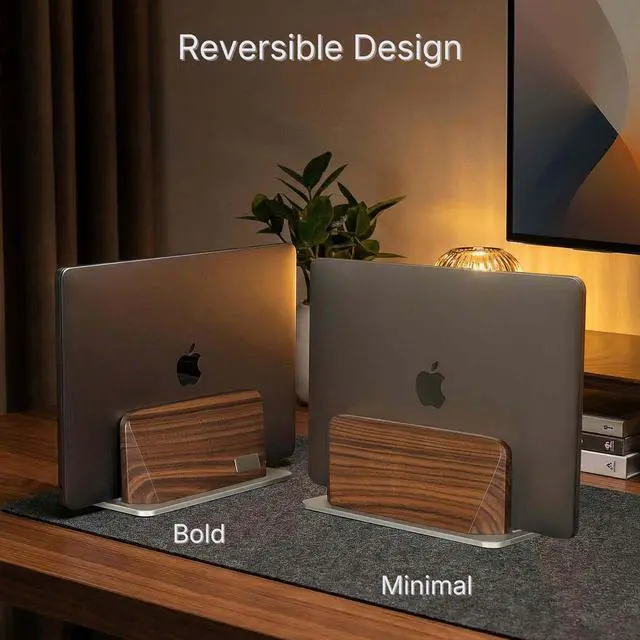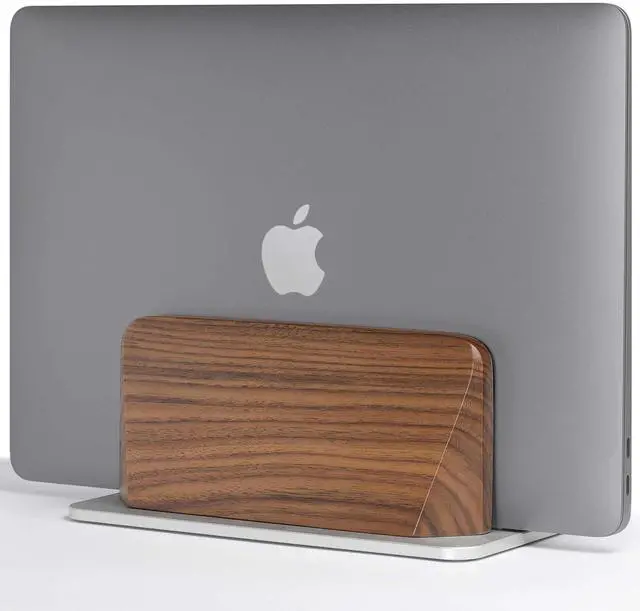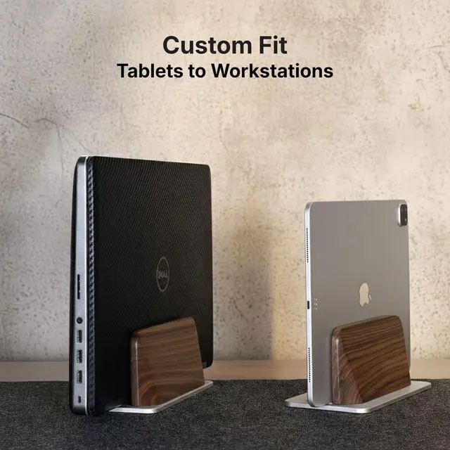 ELEVATE YOUR WORKSPACE - Instantly reclaim desk space. This premium laptop stand vertical holds your notebook upright, turning a cluttered desk into a professional setup. Crafted from 100% genuine Black Walnut for a warm, sophisticated look. ^^ A PERFECT, CUSTOM FIT ( 0.47" - 1.57" Width) - A smart, screw-adjustable base ensures this laptop stand wood provides a precise fit for devices from 0.35 to 1.5 thick. Ideal for iPads, MacBooks, Dell XPS, and most modern laptops. ^^ SCRATCH PROTECTION - We protect your expensive asset. This laptop vertical stand features a "Tender Touch" inside, with premium soft felt lining and silicone grooves to gently cradle your device without a single scratch.