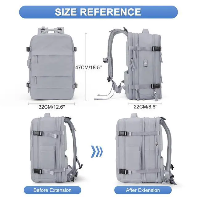 ^^ USB Port DesignThis backpack has a USB charging port, which can be connected to a power bank inside the bag, and a cell phone connected to the outside of the bag through a data cable, allowing you to charge your cell phone or iPad while walking, reducing the burden on your hands and avoiding miss information. Please note that the backpack does not come with a power bank and data cable, it is only for the convenience of mobile phone charging. ^^ Approved By Most FlightsExternal dimensions are 18.512. 68.6 inches (HWD), 2.8 lbs weight (manual measurement, for reference only, subject to actual measurement).