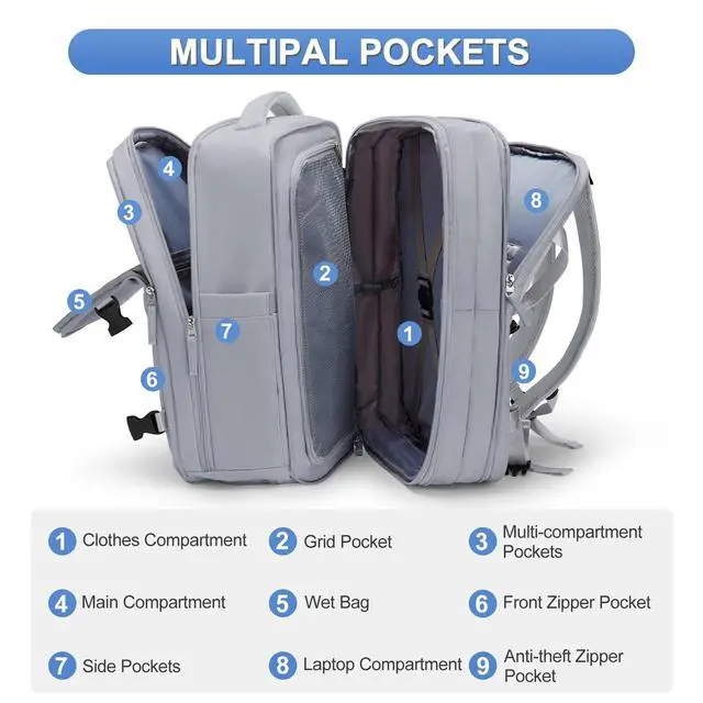 Extra Large Expandable DesignThe everyday clothing pockets can hold 6-8 lightweight tops or pants. This travel bag also features an expandable capacity space for placing more clothes, along with clothing straps, catering to the needs of a family's short trips. The separate laptop compartment can accommodate a maximum 15.6" laptop, meeting your work or daily leisure requirements. ^^ Separate Shoes Compartment and Wet PocketThe shoes compartment can hold a pair of slippers or low-top sneakers, allowing you to switch freely in different states of travel, business trips and outdoor sports; the wet pocket is made of high-density waterproof material, which can be used with to store wet items, making your stay in a hotel or apartment more convenient.