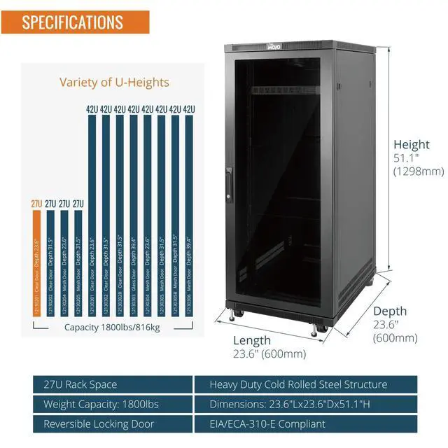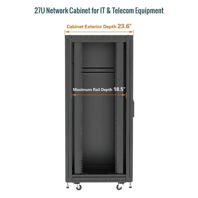 Superior Load Capacity & Robust Frame: Constructed with an extruded steel frame, these server rack cabinets offer a static load capacity of up to1 600lbs (816kg), max mountable depth is 18.5 in, ideal for supporting heavy IT and computer equipment such as servers, switches, and power distribution units (PDUs) ^^