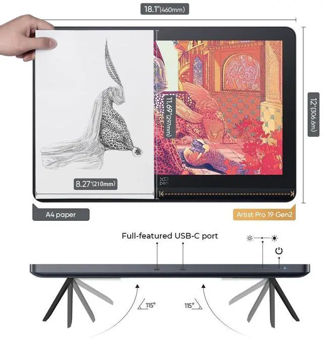 Flexibility: The dual reversible USB-C connections simplify installation and support HDMI input. This design allows professional artists to effortlessly switch between devices like MacBooks, Windows laptops, and tablets without compatibility issues. Both USB-C cables can connect your drawing display to your laptop or tablet, reducing the need for multiple cables and helping to keep your desktop organized. Additionally, the standard VESA adapter (75x75mm) offers versatile mounting options, while the wing-shaped stand ensures stable placement ^^