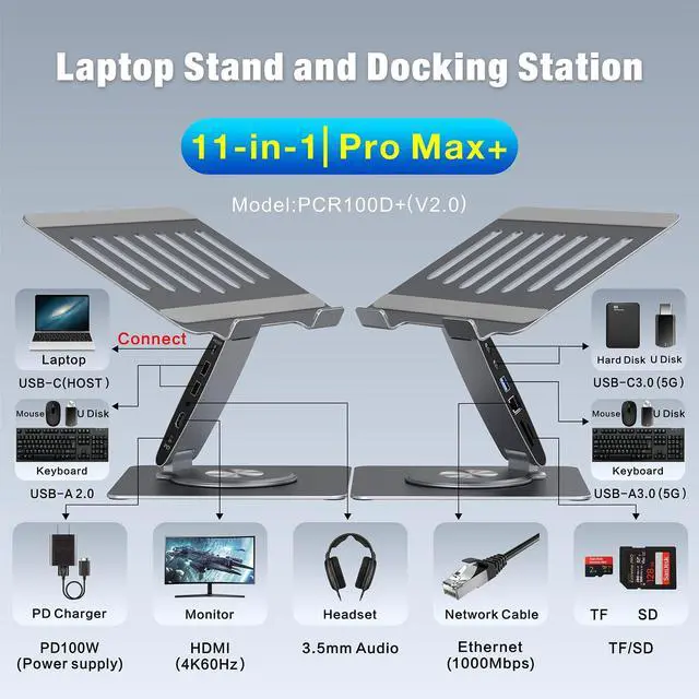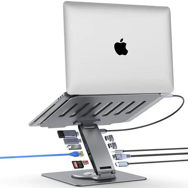 Is it compatible with my laptop? This laptop stand with docking station is engineered for broad operating systems across MacOS, iPadOS, Windows and Android. Enjoy Plug-and-play with no drivers needed. Simply confirm your laptop has a Full-featured USB-C port by referencing the main product image or contacting us for confirmation before the purchase ^^ Is it easy to use the docking station for laptop? Yes, just one step to connect. Use the included cable, connect one end to the Full-featured USB-C port of your laptop, connect the other end to the HOST port on the stand, all ports on the docking station can start to work simultaneously ^^ Is it easy to adjust the laptop stand? The tool-free laptop stand can be easily adjusted to any height or angle (up to 180 degrees at both upper and lower joints) through manual manipulation - simply pull or compress the joints by hand.