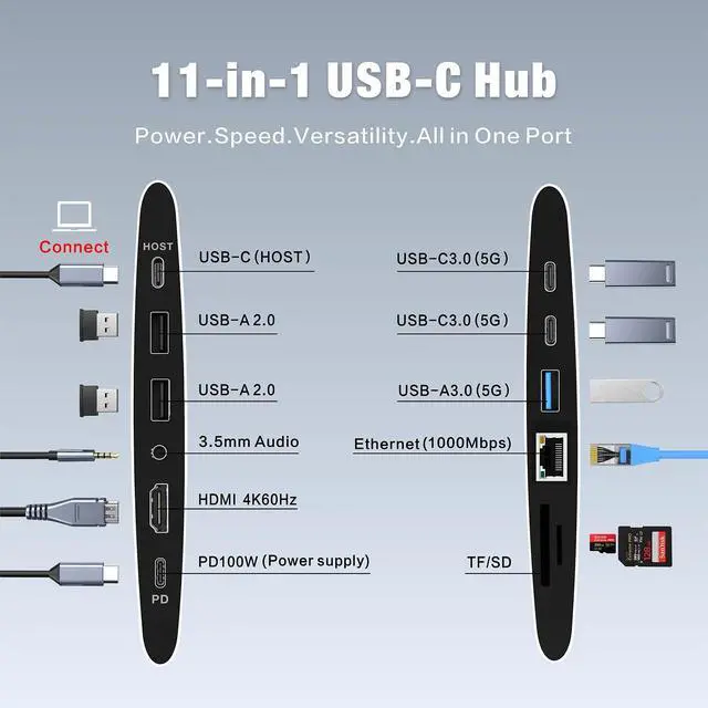 The height range is ideal for ergonomic desk use, enabling you to position the laptop at eye level for comfortable viewing ^^ Will it sag over time? This Compatible with MacBook stand with docking station is designed for lasting stability and wont sag over time. Customers praise its robust build, attributed not only to its aluminum-alloy construction but also to the damping hinge mechanism, which ensures greater durability and long-term performance ^^ What does it come with the laptop stand in the color box? In the gift box there is 1x laptop stand integrated with 11 ports USB-C Hub, 1x full-function USB-C to USB-C cable (~ 19.7 inches long), 1x Instruction Manual ^^ Does it wobble or tip? This laptop stand compatible with MacBook Air is engineered for exceptional stability, securely holding your laptop in place.