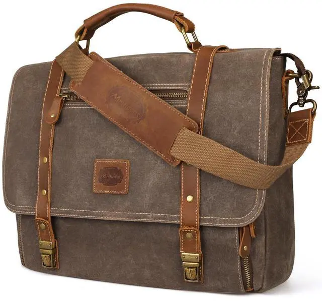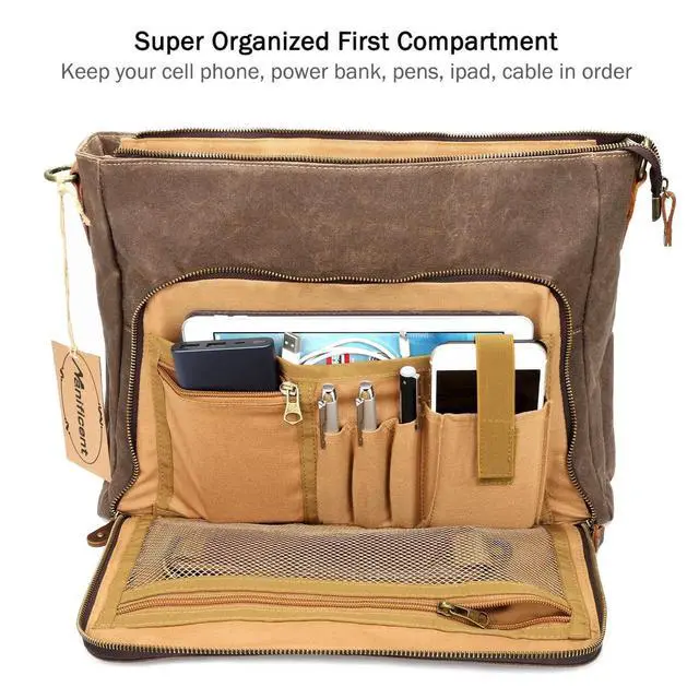 --RESILIENT & WATER-PROOF --The canvas messenger bag is crafted from 80% water proof Solid Canvas + 20% superior cowhide crazy horse leather. Long-lasting, water repellent and shock-resistant. Disordered wrinkles and scratches on surface create a vintage and wild looking. ^^ -- LOTS OF STORAGE SPACE&POCKETS -- Men messenger bag is designed with one separate laptop compartment hold 15.6 Inch Laptop as well as 15 Inch, 14 Inch and 13 Inch Macbook/Laptop, one big compartment for document. The unique front compartment with 7 pockets, pen pockets, cellphone pocket, power bank pocket and mesh pocket, make your items organized and easier to find.