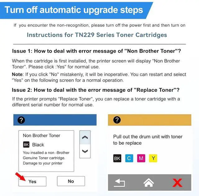 Please check your needs before purchasing ^^ Package Contents2 x tn229xl balck toner cartridges high yield, 1 x User Guide (Total 2 Pack With Chip) ^^ Serious InspectionAll of HenceBuy TN229XL TN229XLBK Toner Cartridges must be tested seriously. Ensure excellent ink quality will not clog the print head, print clear and bright picture smoothly, delivers sharp Texts, vivid Images and outstanding quality