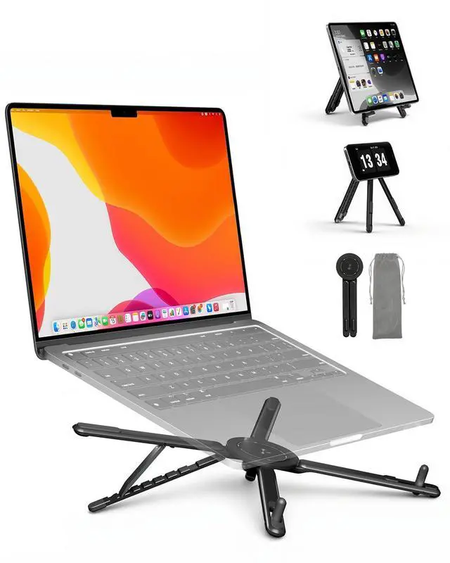 ^^ Foldable & Portable Design This adjustable laptop stand folds flat and comes with a storage pouch, making it easy to carry in a backpack or laptop bagideal for office, home, coffee shops, or travel. ^^ Durable Aluminum Alloy Construction Made of high-quality aluminum alloy, the stand offers solid support while remaining lightweight. Compatible with most laptops, tablets, and smartphones on the market.