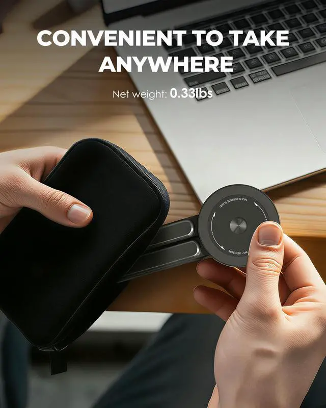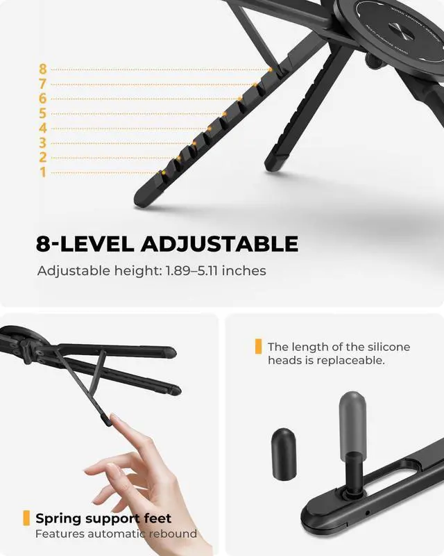 3-in-1 Adjustable Laptop Stand This adjustable laptop stand features a versatile 3-in-1 design, working as a laptop stand, tablet stand, and phone stand. Built-in magnetic structure allows quick switching between devices, keeping your desk neat and efficient. ^^ Multi-Angle & Height Adjustable Designed with multiple adjustable arms and joints, this adjustable laptop stand lets you freely customize viewing height and angle to suit different working, reading, or viewing positions. ^^ Strong Magnetic & Stable Support Equipped with a powerful magnetic base and non-slip silicone pads, the stand securely holds laptops, tablets, and smartphones in place without sliding or shaking during use.
