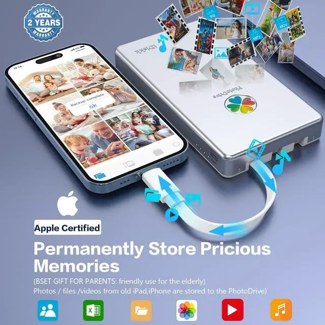 No software installation required and intuitively drag and drop files to and from your PC or Macbook. ^^ MFi Certified & Widely Compatibility with ALL iPhone/iPad/Mac/Android/PC- MFi Certified chip and connector guarantee stable and safe data transfer for your iPhone and iPad/iPad pro series. ( iPhone 17/16/15/14/13/12/11, 13/12/11 Pro, 13/12/11 Pro Max, 13/12 Mini, SE, XR, XS, XS Max, X, 8 /7/6S/6 Plus, 8/7/6S/6, 6/5S, iPad 5/6/7/8/9, Mini 2/3/4/5/6 iPad Air-Serie, iPad Pro-Series) ^^ Plug and Play- Using this hard drive is very easy, all you need to do is simply connect it to your phone or other mobile devices, then you can start doing the file transfer directly; No matter whether you're using it on a cellphone, or on a computer, the operations are all similar like using a USB flash drive, copy and paste, that's it ^^ Hard Drive for