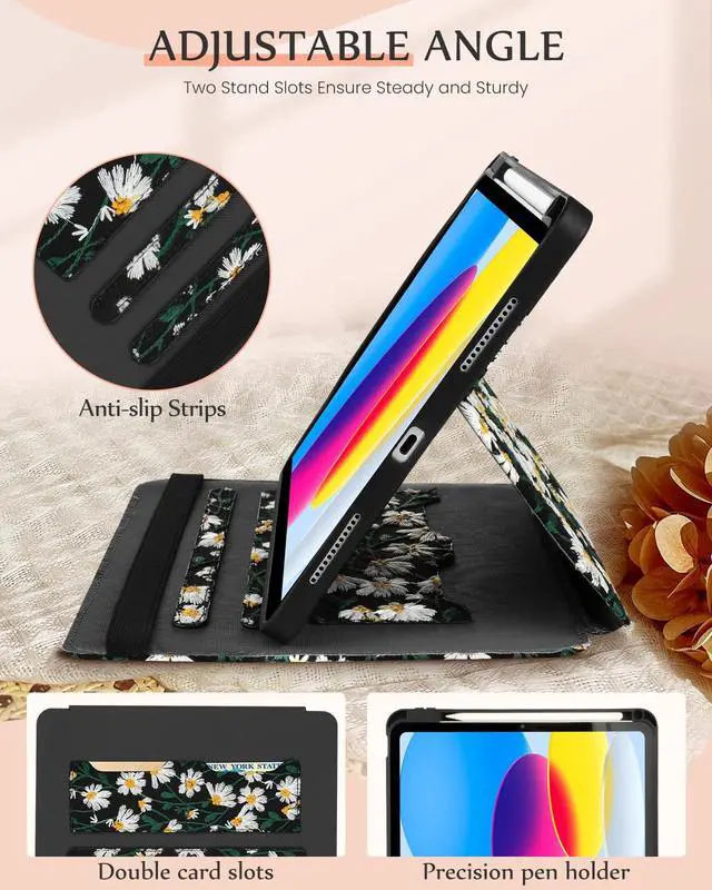 Card Slots & Auto Sleep/Wake: This embroidered tablet case has two card slots for bank cards, business cards and other cards. Built-in magnetic strip, this for iPad 10th/11th gen cover has an auto sleep/wake feature, no wasting the power energy and extend your iPad standby time. ^^