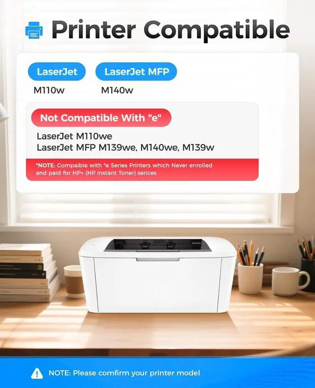 ^^ Compatible Printers: Compatible with HP LaserJet M110w MFP M140w Printer. not Compatible for "HP+" Service "e" Series Printer. For example Not Compatible for HP Laserjet M139w Printer.