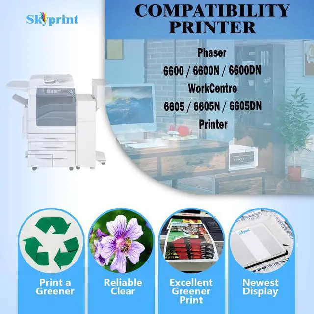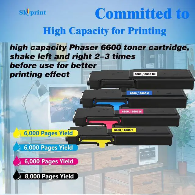 SkyPrint Phaser 6600 toner cartridges come with intelligent chips that automatically recognize and provide printing, Not damaging the machine,Shake the toner cartridge horizontally 2-3 times before use to evenly distribute the toner,providing you with better clear and natural printing effects