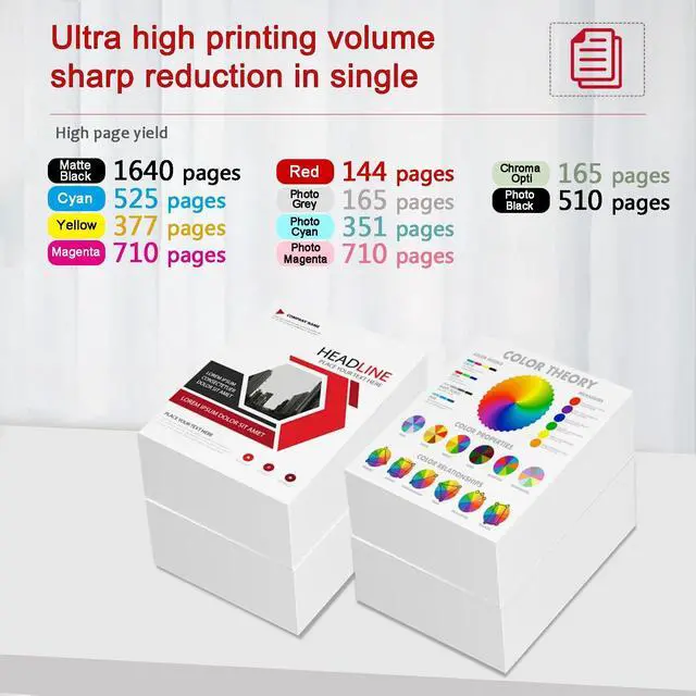 High Page Yield: Up to 510 pages per Photo Black Cartridge, 1640 pages per Matte Black Cartridges, 525 pages per Cyan Cartridges, 710 pages per Magenta Cartridges, 377 pages per Yellow Cartridges, 351 pages per Photo Cyan Cartridges, 710 pages per Photo Magenta Cartridges, 144 pages per Red Cartridges, 165 pages per photos Gray Cartridges, 165 pages per Chroma Opti Cartridges ^^