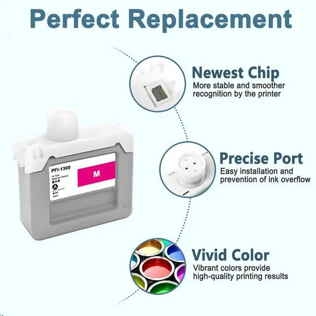 Superior Quality: This high-yield PFI-1300 ink cartridge uses the latest chip technology and high-quality pigment ink, with an anti clogging nozzle design and easy installation. Provide clear text and graphics ^^