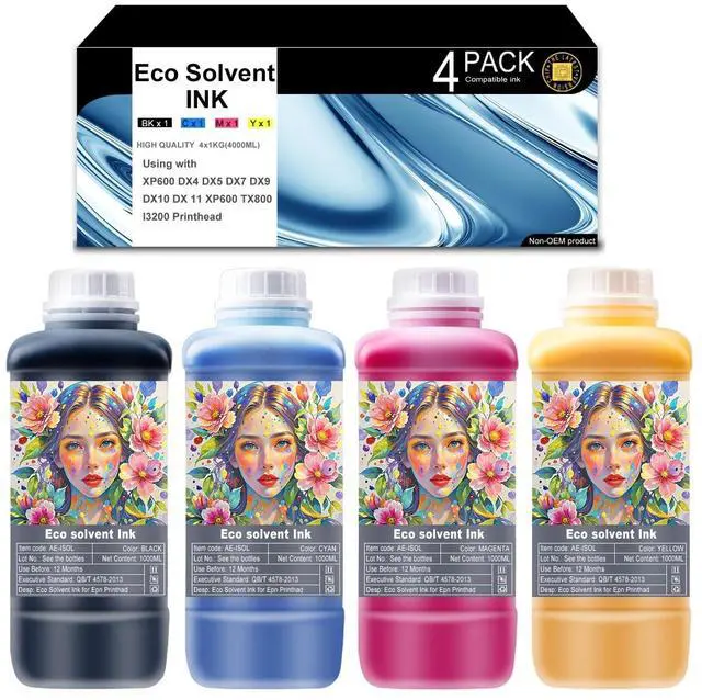 AITERJET Eco Solvent Ink for Wide Format, Grand Format Printers with DX4 DX5 DX7 DX9 DX10 DX 11 XP600 TX800 I3200 (CMYK 1 Set /1000ml) Printhead Mimaki/Roland/Mutoh NOT Work with Desktop Printers
