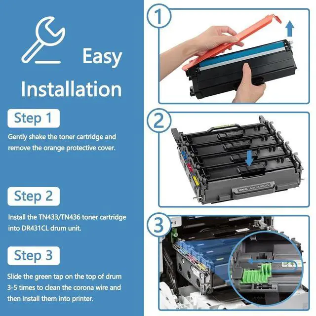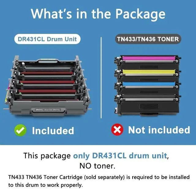 Replacement Brother DR431 CL Drum Unit. This item is only the drum unit, not contain toner. You need to use with TN431 TN433 or TN436 toner cartridges. ^^ DR431 CL Drum Unit Perfect Work with Brother HL-L8260CDN HL-L8260CDW HL-L8360CDW HL-L8360CDWT HL-L9310CDW HL-L9310CDWT HL-L9310CDWTT MFC-L8610CDW MFC-L8895CDW MFC-L8900CDW MFC-L8905CDW MFC-L9570CDW MFC-L9570CDWT Printer. ^^ Drum DR431CL High Page Yield - Up to 30, 000 Pages Per DR-431CL color Drum Cartridge at 5% coverage ISO/IEC 19752 (letter/A4). ^^ MxVol DR-431CL After-sales Service - We always stand by for your needs, even though refund window is close.