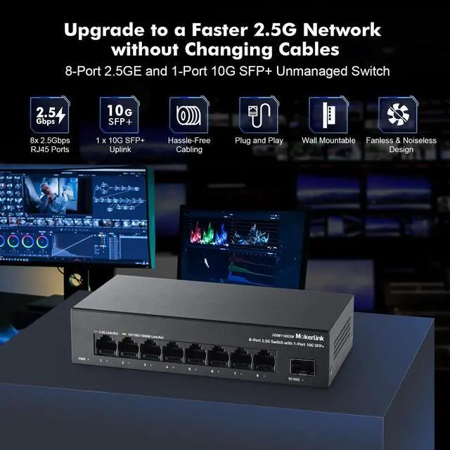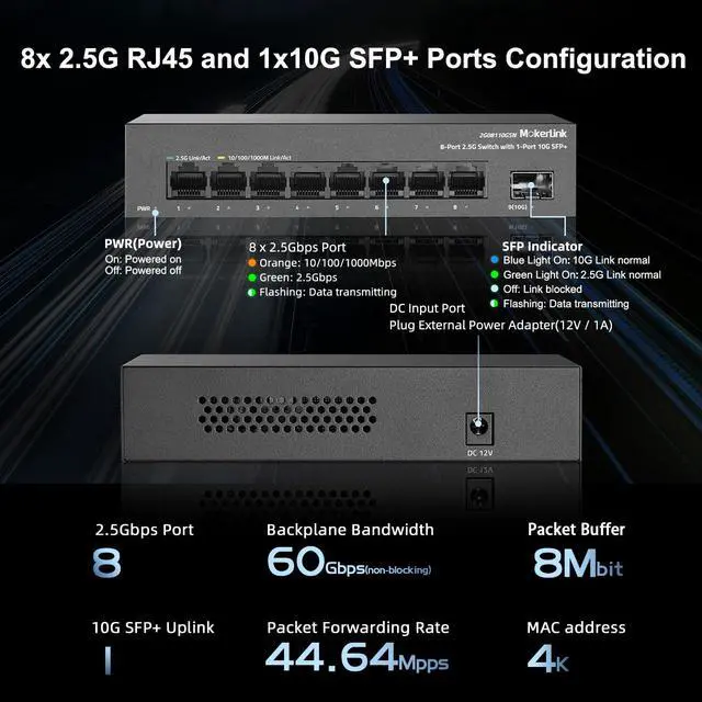 Ports: The network switch has 8x 2.5G igabit Ethernet Ports, compliant IEEE 802.3 bz ( 2.5G ) standard, support 10/100/1000M/ 2.5G adaptive. 1x10G SFP+ Port(support 1G/ 2.5G Module, not include SFP Module). 60Gbps backplane bandwidth, excellent data forwarding performance ^^ Easy to