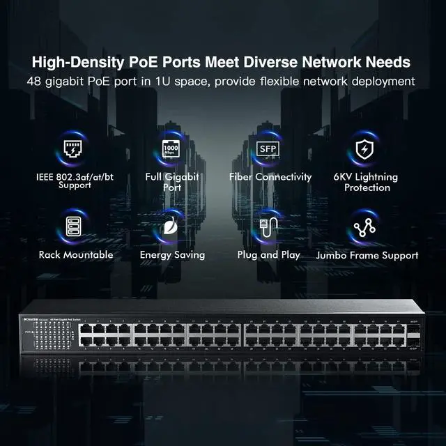Gigabit Ports: 48 gigabit ethernet ports, 2 Gigabit SFP, switching capacity is 112Gbps, each port can reach 1G rate at the same time, with higher data throughput. 8K Mac address table, more devices can be connected and can be used in large networks ^^