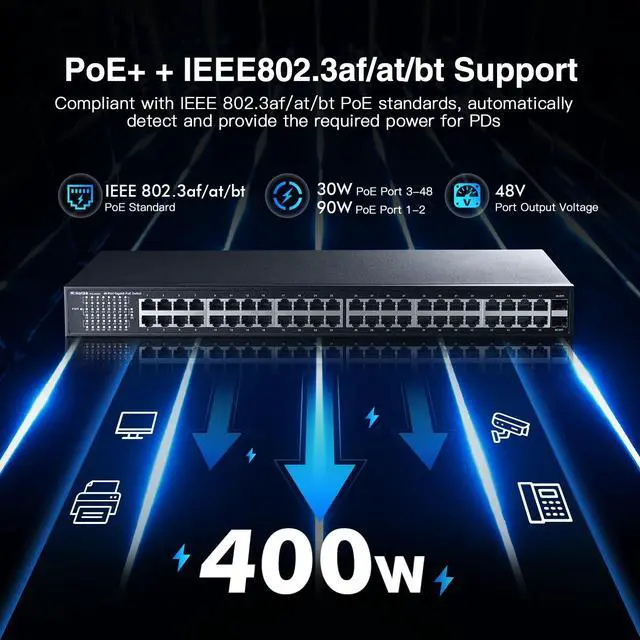 IEEE 802.3 af/at/bt 400W: All ports 1-48 support IEEE 802.3 af/at PoE standard max 30W, port 1-2 also support IEEE 802.3 bt max 90W, built-in power supply, the whole machine supports 400W *Please note: it will not supply power to passive 24V PoE and NON-PoE devices. *.