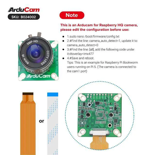 Set Up: This camera comes with 2 cables, a 300mm 22-22pin cable for Raspberry Pi5/Zero, and a 300mm 15-22pin cable for Raspberry Pi 4B/3B... Simply connect the cable and edit the configuration by following the user guide at the first use, it can be used smoothly ^^
