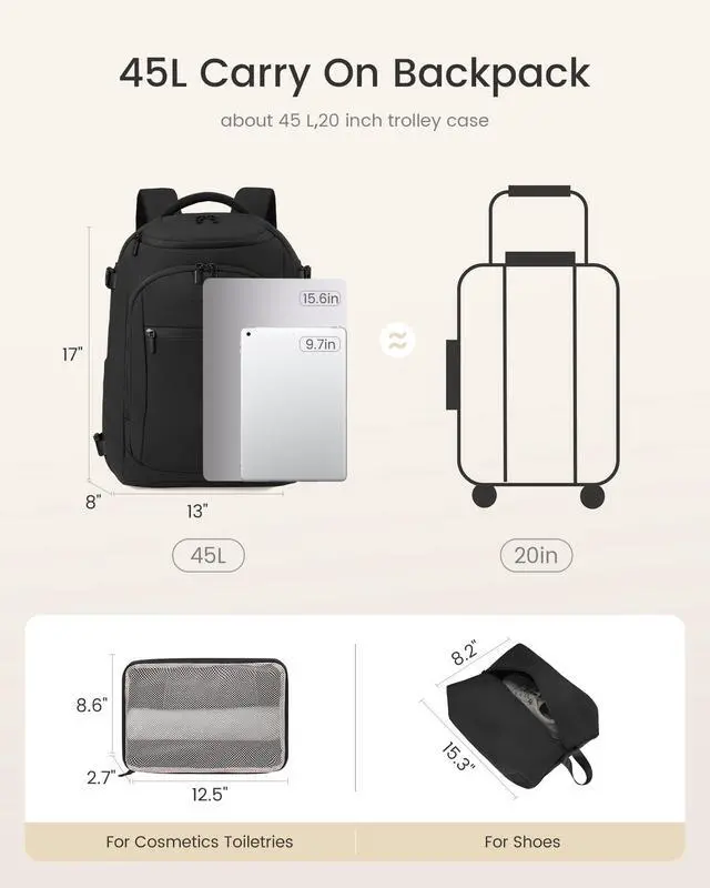 Large Capacity & Multiple PocketsThis travel backpack features a 40L large capacity and 5 main compartments, meeting the needs of daily commuting and travel. The main compartment of this women's travel backpack can store a variety of items, including 68 pieces of clothing and more. It also includes a separate dirty clothes compartment for easier organization. The dedicated laptop sleeve is padded with thickened EVA foam to provide secure protection for a 18inch laptop. ^^ Versatile Use & Airline ApprovedThis airplane backpack with dimensions of 13817 inches (approx. 332043 cm), this personal item travel bag fits perfectly under the seat in front of you or in the overhead bin.