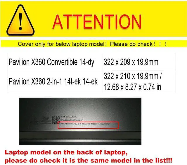 Compatible Models: This cover/case only fits for Pavilion X360 Convertible 14-dy, Pavilion X360 2-in-1 Laptop 14t-ek 14-ek. Cover dimensions (W