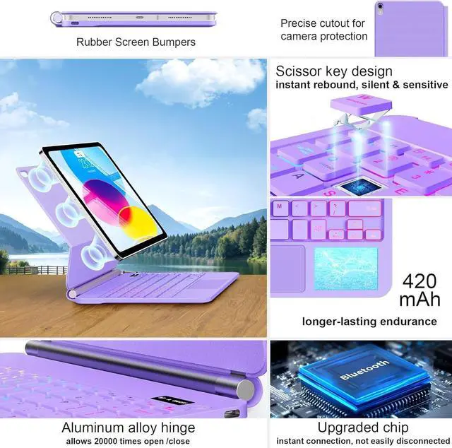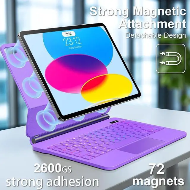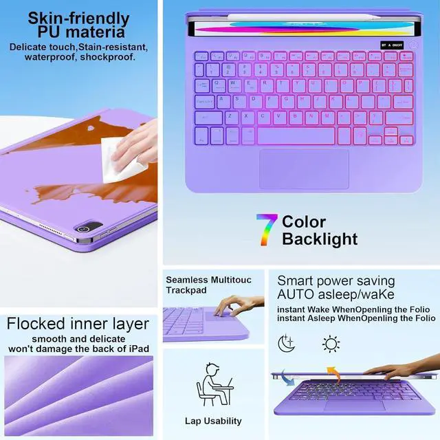 Generation: The keyboard is equipped with a 7-color backlight, adjustable to three different brightness levels. Pleas press FN + Space keys to switch 7 backlight. This feature not only adds a touch of style but also makes typing in low-light conditions more comfortable. The backlighting is engineered for optimal light diffusion, providing a pleasant typing experience whether youre working during the day or night. From dawn to dusk, adapt effortlessly! ^^ Multi-touch trackpad Keyboard for iPad 10.9 inch 10th