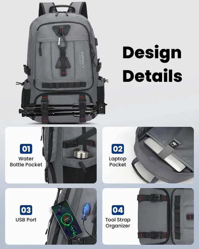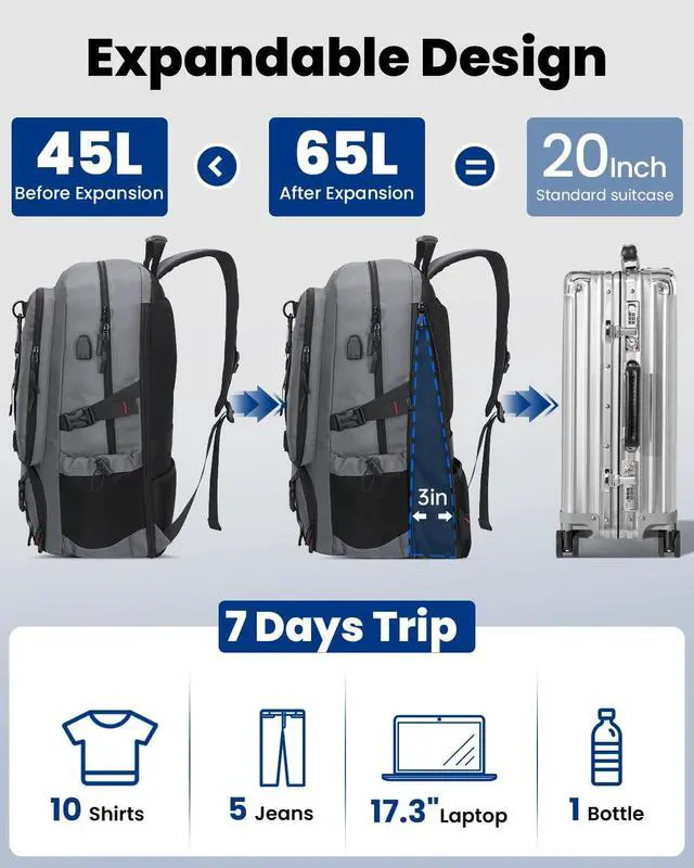 Spacious Main CompartmentLarge main compartment with built-in laptop sleeve, mesh pocket, and zippered pocket to keep electronics and personal items organized during travel. ^^ Multi-Functional Exterior PocketsSide mesh pockets for water bottles or umbrellas and a front zippered pocket for quick-access items. ^^ Wet-Dry Separation PocketExterior wet-dry pocket opens 180 to store wet items while keeping other belongings dry and organized. ^^ Comfortable & Versatile CarryingAdjustable shoulder straps and webbing for multiple carrying styles; durable plastic hand grip for easy lifting. ^^ Expandable Capacity & USB PortExpand backpack by 5 cm for extra storage; built-in USB port allows charging devices on the go.