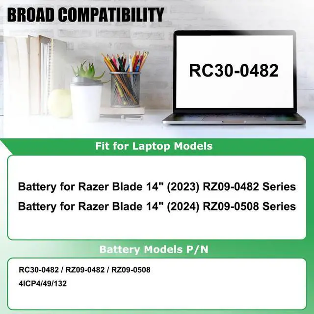 Models: (use "Ctrl+F to find your model quickly")Battery for Razer Blade 14" (2023) RZ09-0482 SeriesBattery for Razer Blade 14" (2024)