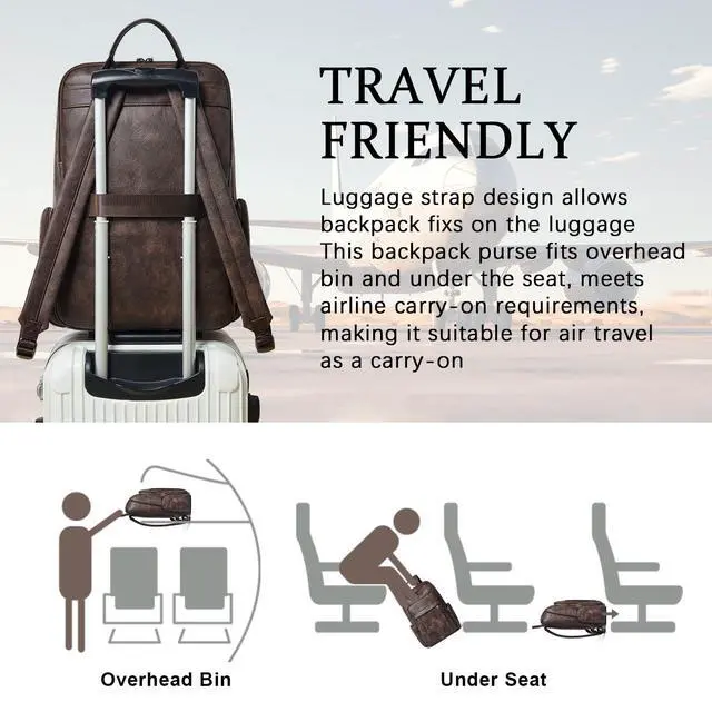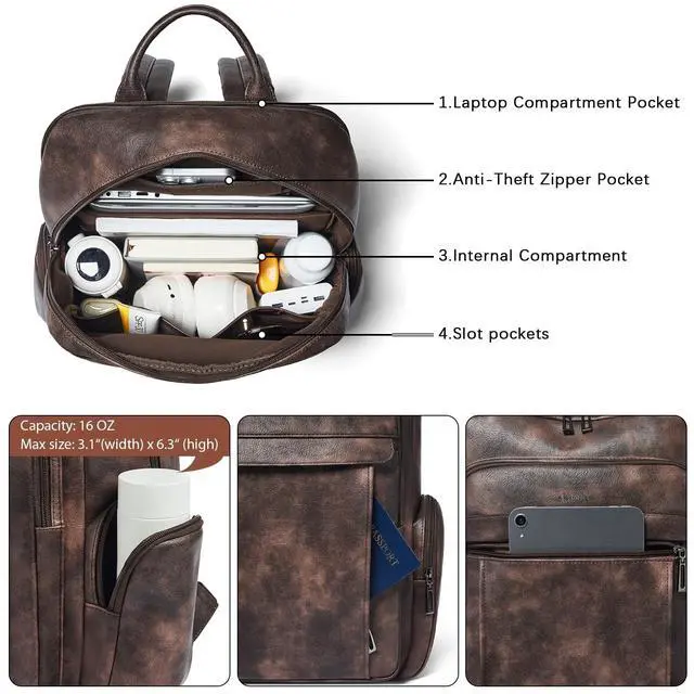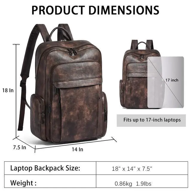 Premium Materials: Our leather laptop backpack is crafted from soft, durable faux leather and lined with abrasion-resistant fabric. To ensure exceptional quality and durability, this leather backpack features reinforced stitching, gunmetal hardware, thickened, pressure-relieving, adjustable shoulder straps and durable zippers. Its simple yet elegant design complements any outfit. ^^ Multi-Compartment DesignThis travel backpack with 11 pockets, the main double-zippered compartment features an inner zipped pocket, two slip pockets and a padded for electronics. On the outside, there is a laptop compartment zipped pockets, two front zipped pockets, two side zipped pockets and two concealed zipped pockets. There is ample space for your laptop, mobile phones, books, iPads, A4 documents, umbrellas, power bank, glasses, cosmetics and clothing.