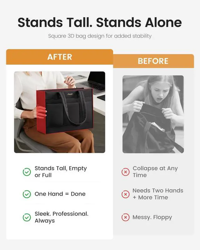 View: The built-in frame design ensures the bag remains upright and stylish even when empty. Combined with a wide rectangular opening, the contents are clearly visible, allowing for quick access and helping you maintain a composed and professional image in any situation. ^^ More Than Just Size, More