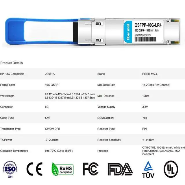 QSFP+ 40G HPE ( H3C ) 40Gigabit Ethernet, coding as HPE ( H3C ) JG661A also compatible ^^ 40GBASE-LR440G QSFP+ transceiver module, 40Gbps, single mode, 1310nm, CWDM4, 10km, LC duplex connector, Hot Pluggable, support DOM ^^ Protocols SATA/SAS3, IEEE 802.3 ba, QSFP MSA Compliant ^^ 3 WARRANTY30-Days Free-returned, 65-Days Free-replacement, 5-Years Free-maintenanceProvide customized services. ^^ CustomizationFibermall supports regular custom service for your options