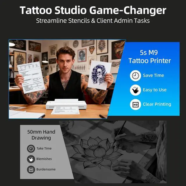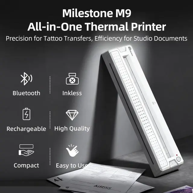 Upgraded 2-in-1 Tattoo Stencil & Document PrinterThe Milestone M9 is the all-in-one solution that streamlines your studio workflow. Instantly switch from printing sharp, high-resolution tattoo stencils on transfer paper to producing smudge-proof client documents on thermal paperall with one compact tattoo printer machine that saves space and simplifies operations. ^^ Professional Thermal Tattoo PrinterSay goodbye to messy carbon paper forever. This thermal tattoo transfer printer delivers clean, accurate stencils every time. Create intricate transfer patterns in secondsperfect for fine-line, geometric, and realistic designswith no smudging or material waste.