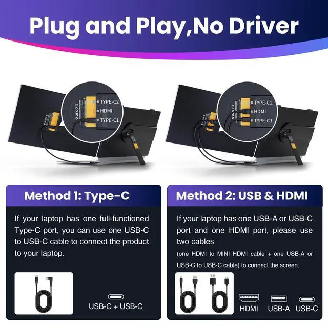 driver required]: If your laptop has one full-functioned Type-C port, you can use one USB-C to USB-C cable to connect the product to your laptop. If your laptop has one USB-A or USB-C port and one HDMI port, please use two cables (one HDMI to USB-C cable + one USB-A or USB-C to USB-C cable) to connect the screen.